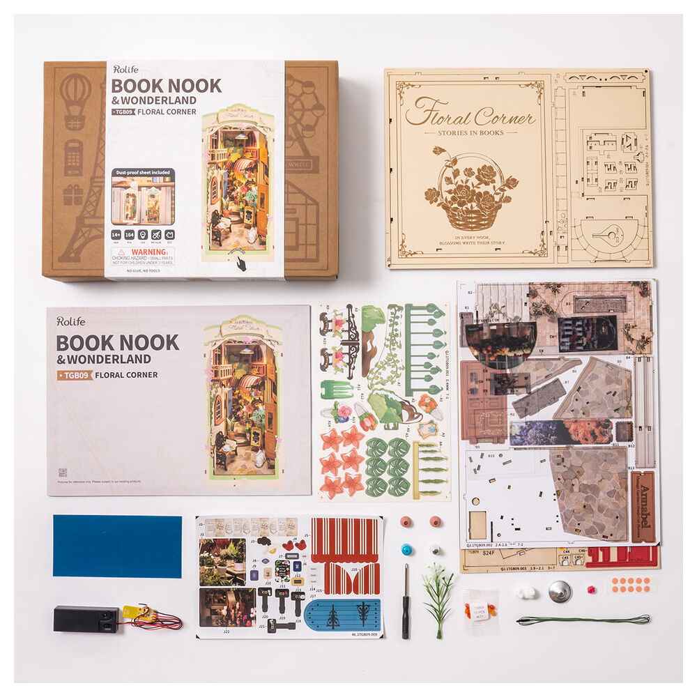 Modelo 3D que recria um encantador rincão floral, ideal para decorar estantes como suporte decorativo. Inclui 164 peças pré-cortadas e pré-coloridas, com detalhes como florista, cartaz vintage e elementos naturais, além de iluminação LED e proteção contra pó. Mede 19x10,8x24 cm, oferecendo um cenário detalhado e relaxante.