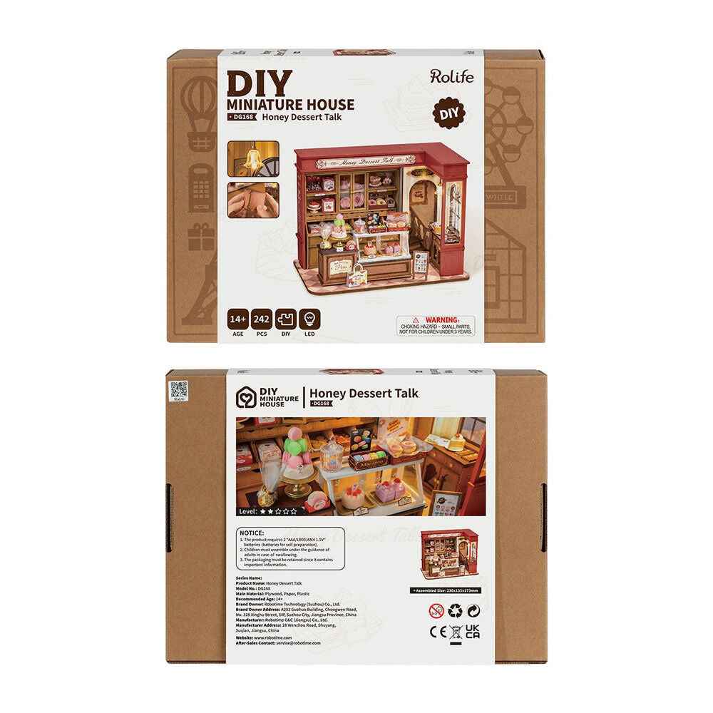 Modelo 3D que recria uma pastelaria de estilo parisiense, com vitrinas cheias de macarons, bolachas, donuts e pequenos bolos para montar e posicionar ao gosto. O kit inclui 242 peças em madeira, papel e plástico, com montagem precisa e sem necessidade de cola. Conta ainda com iluminação LED para criar um ambiente acolhedor e realista na estante.